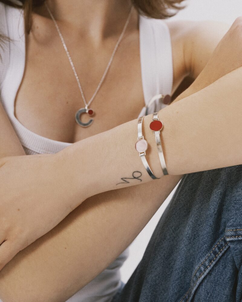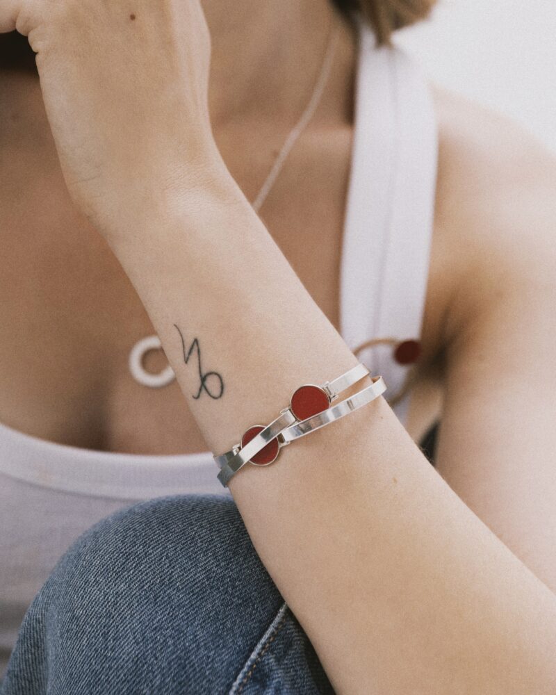 Elegancka bransoletka z charmsem. Została wykonana ze srebra próby 925 oraz czerwonego próbnika lakieru. Idealne zupełnienie kobiecego nadgarstka. Subtelna, minimalistyczna i pasująca do wielu stylizacji. Bransoletka została wykonana ręcznie przez pracownię jubilerską w Trójmieście.