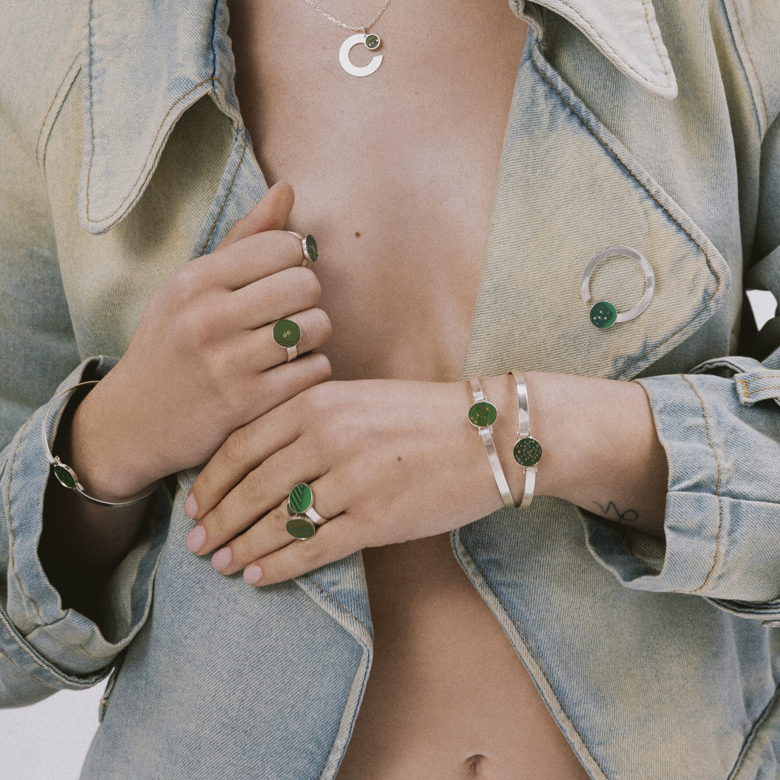 Kolekcja Essentials składa się z elementów takich jak: naszyjnik, broszka, bransoletka, pierścionek i kolczyki. Każdy model biżuterii został wykonany ręcznie, ze srebra próby 925, w pracowni w Trójmieście. Zestawienie metalu szlachetnego i ponowne wykorzystanie próbników lakieru oraz układów scalonych tworzy wyjątkową synergię. Jest to biżuteria najwyższej jakości, która równocześnie promuje idee wrażliwości ekologicznej.