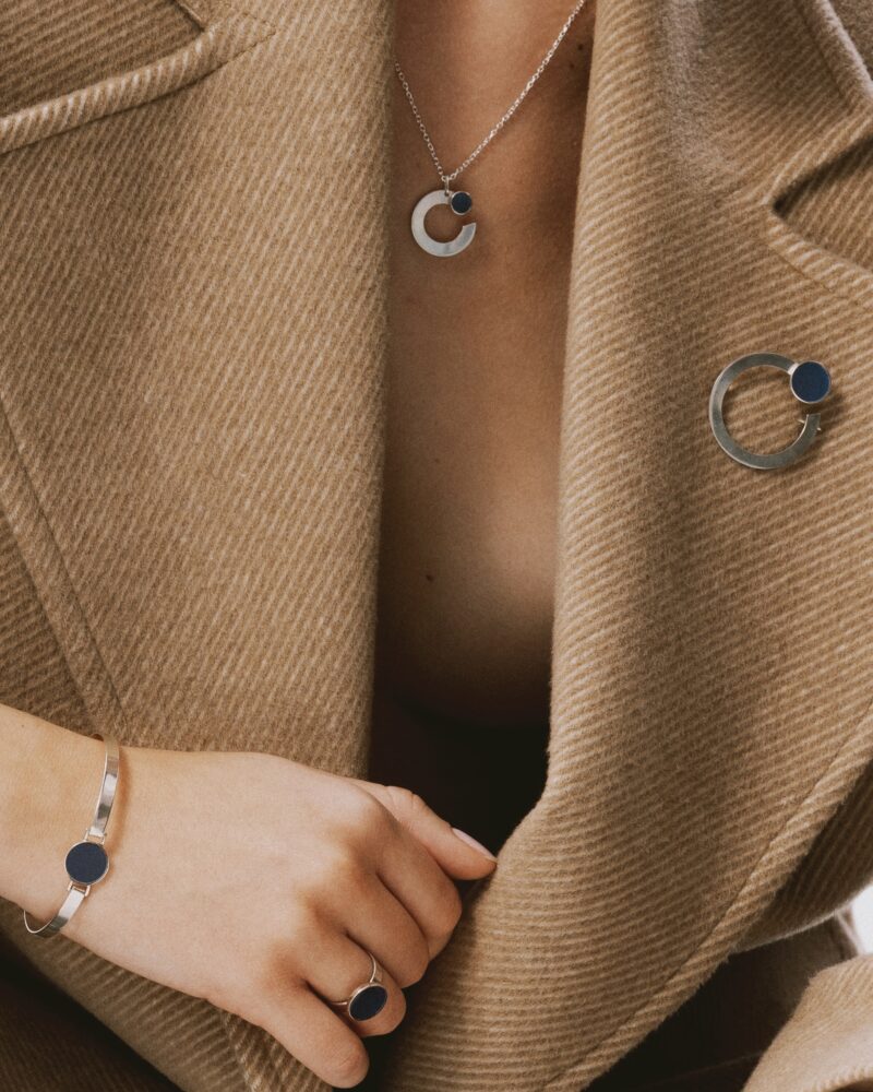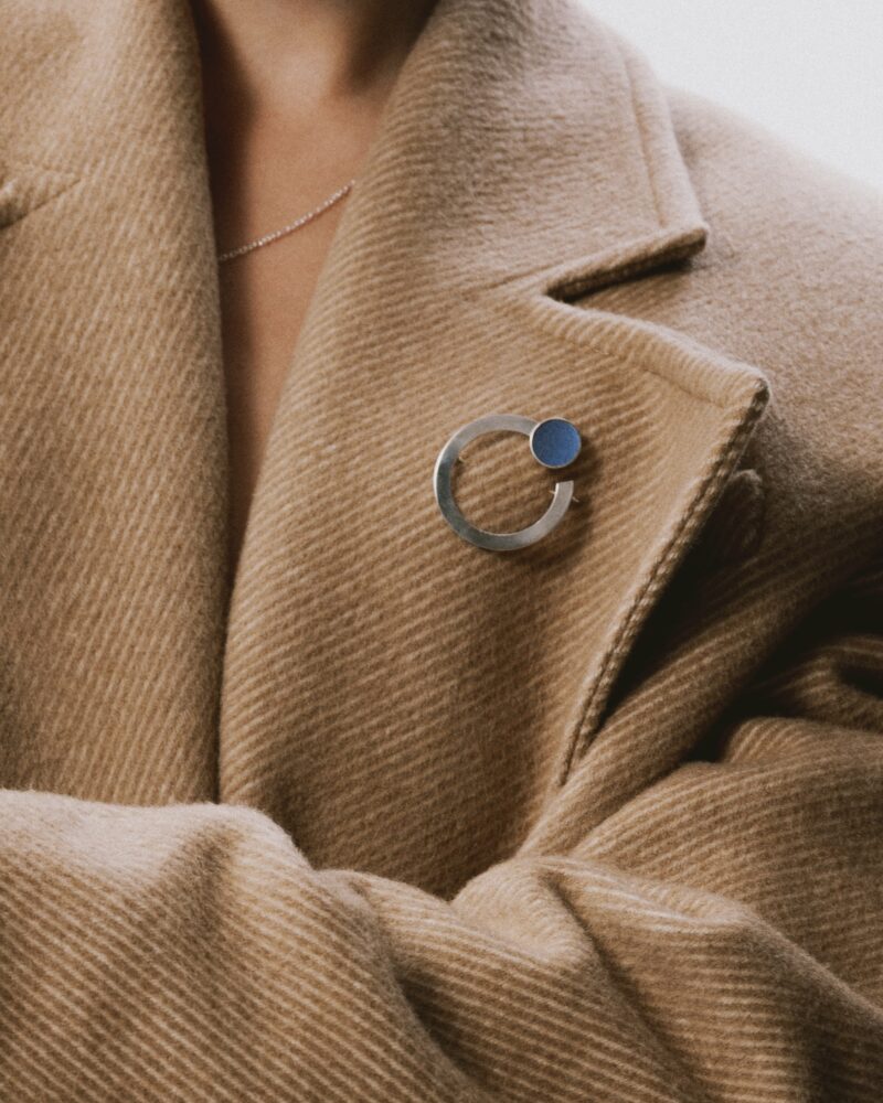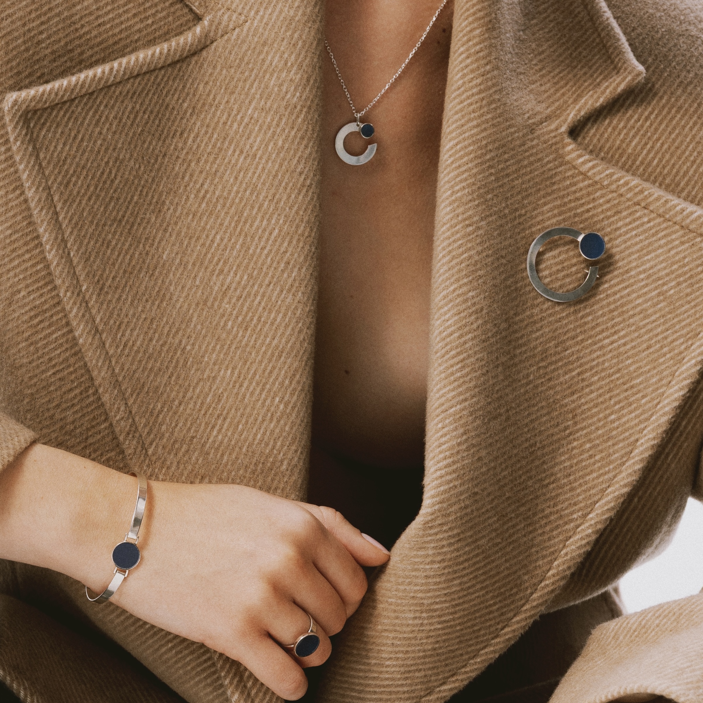 Elegancka broszka wykonana ze srebra próby 925 oraz granatowego próbnika lakieru. Idealne zupełnienie swetrów oraz marynarek. Subtelna, minimalistyczna i pasująca do wielu stylizacji. Broszka została wykonana ręcznie przez pracownię jubilerską w Trójmieście.