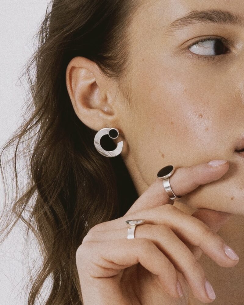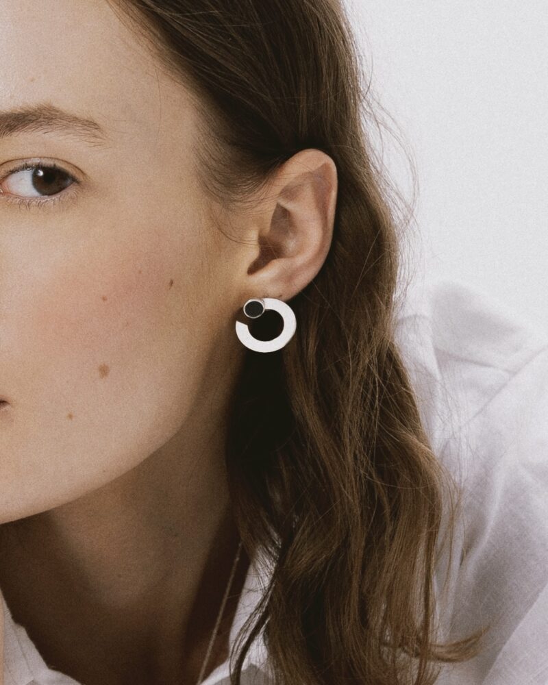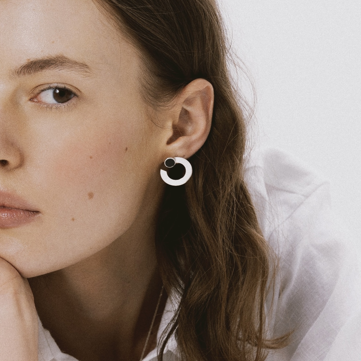 Duże kolczyki sztyfty z obręczą wykonane ze srebra próby 925 oraz czarnego próbnika lakieru. Kolczyki długością sięgają odrobinę poniżej opuszka ucha. Efektowne, minimalistyczne i pasujące do wielu stylizacji. Kolczyki zostały wykonane ręcznie przez pracownię jubilerską w Trójmieście.