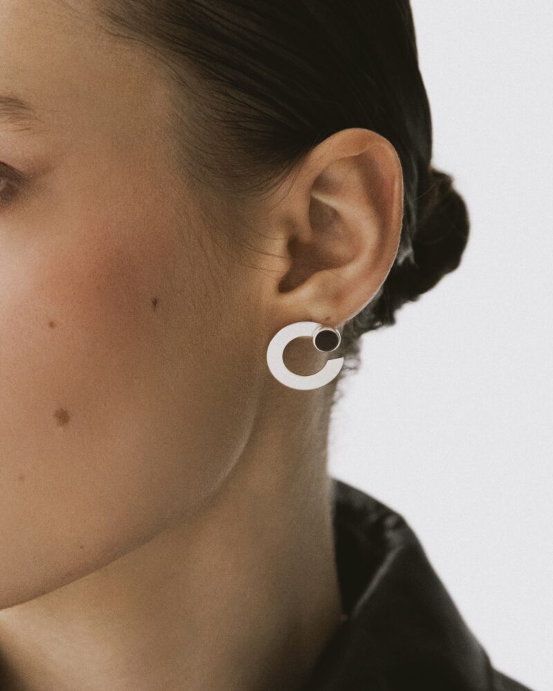 Duże kolczyki sztyfty z obręczą wykonane ze srebra próby 925 oraz czekoladowego próbnika lakieru. Kolczyki długością sięgają odrobinę poniżej opuszka ucha. Efektowne, minimalistyczne i pasujące do wielu stylizacji. Kolczyki zostały wykonane ręcznie przez pracownię jubilerską w Trójmieście.