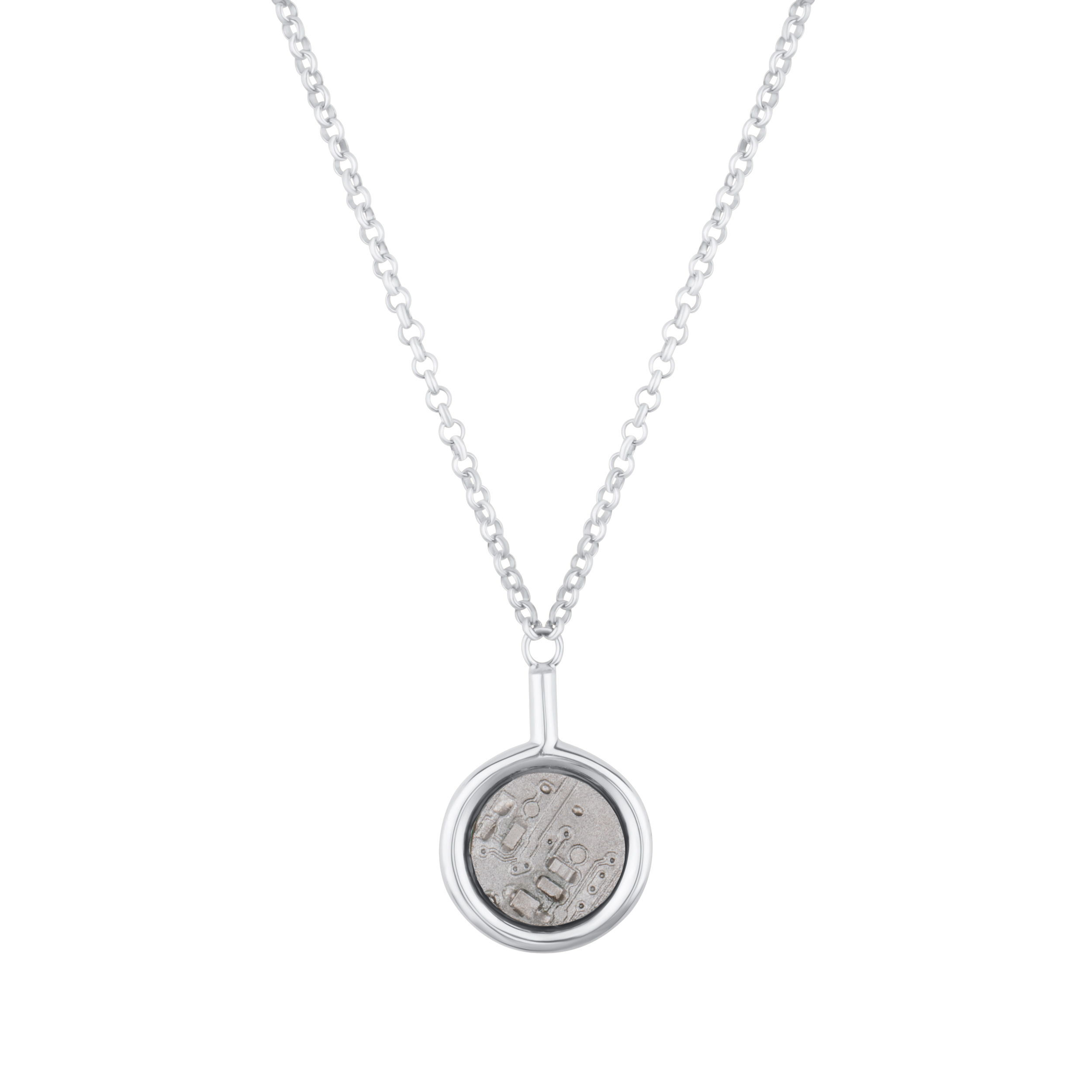 Subtelny naszyjnik z zawieszką wykonany ze srebra próby 925 oraz fragmentu układu scalonego to minimalistyczny i ponadczasowy element biżuterii codziennej. Do jego produkcji zostały wykorzystane zużyte układy scalone, czyli fragmenty elektroniki, które pochodzą z samochodów marki Volvo.