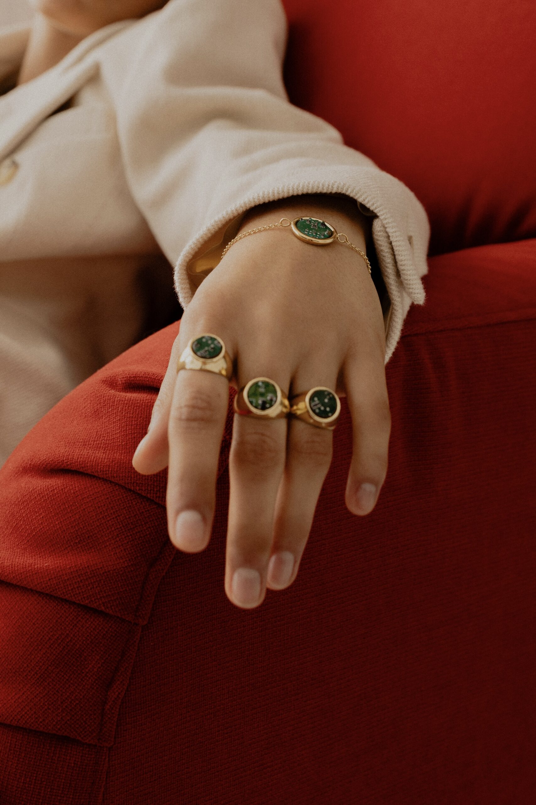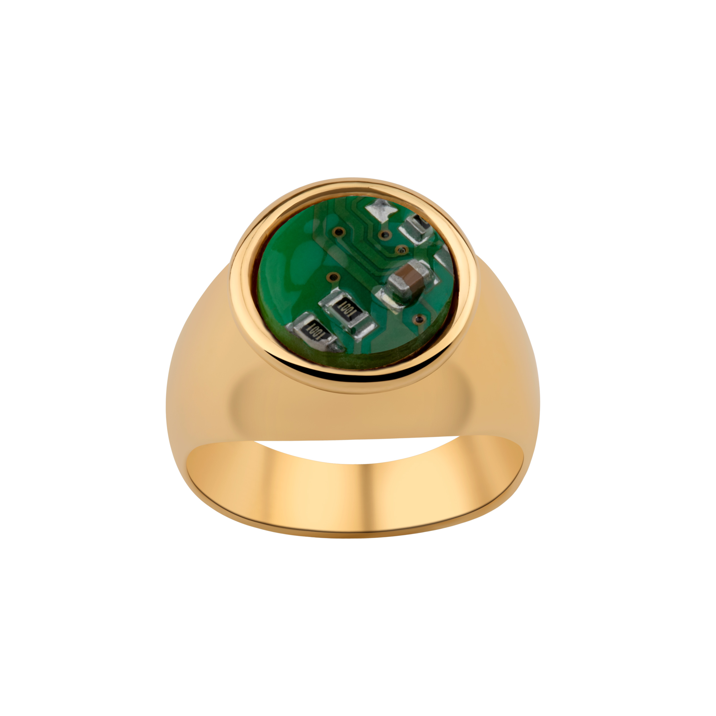 To, co wyróżnia ten pierścionek to fragment układu scalonego osadzony w gładkiej, pozłacanej oprawie o minimalistycznej formie. Układ został zabezpieczony specjalną żywicą, która chroni przed uszkodzeniami i skaleczeniami. Dzięki warstwie ochronnej element elektroniki nabrał intensywniejszego koloru i połysku. Prosta, nowoczesna forma sprawia, że pierścionek doskonale sprawdzi się zarówno w codziennych, jak i bardziej eleganckich stylizacjach.