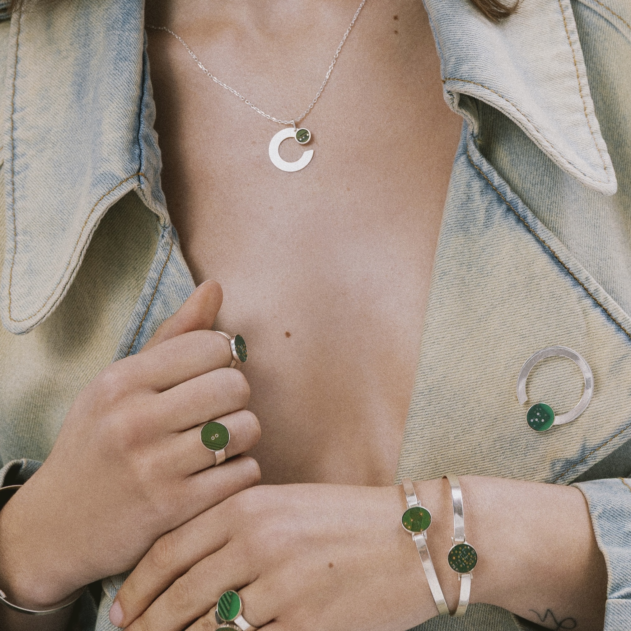 Kolekcja Essentials składa się z elementów takich jak: naszyjnik, broszka, bransoletka, pierścionek i kolczyki. Każdy model biżuterii został wykonany ręcznie, ze srebra próby 925, w pracowni w Trójmieście. Zestawienie metalu szlachetnego i ponowne wykorzystanie próbników lakieru oraz układów scalonych tworzy wyjątkową synergię. Jest to biżuteria najwyższej jakości, która równocześnie promuje idee wrażliwości ekologicznej.