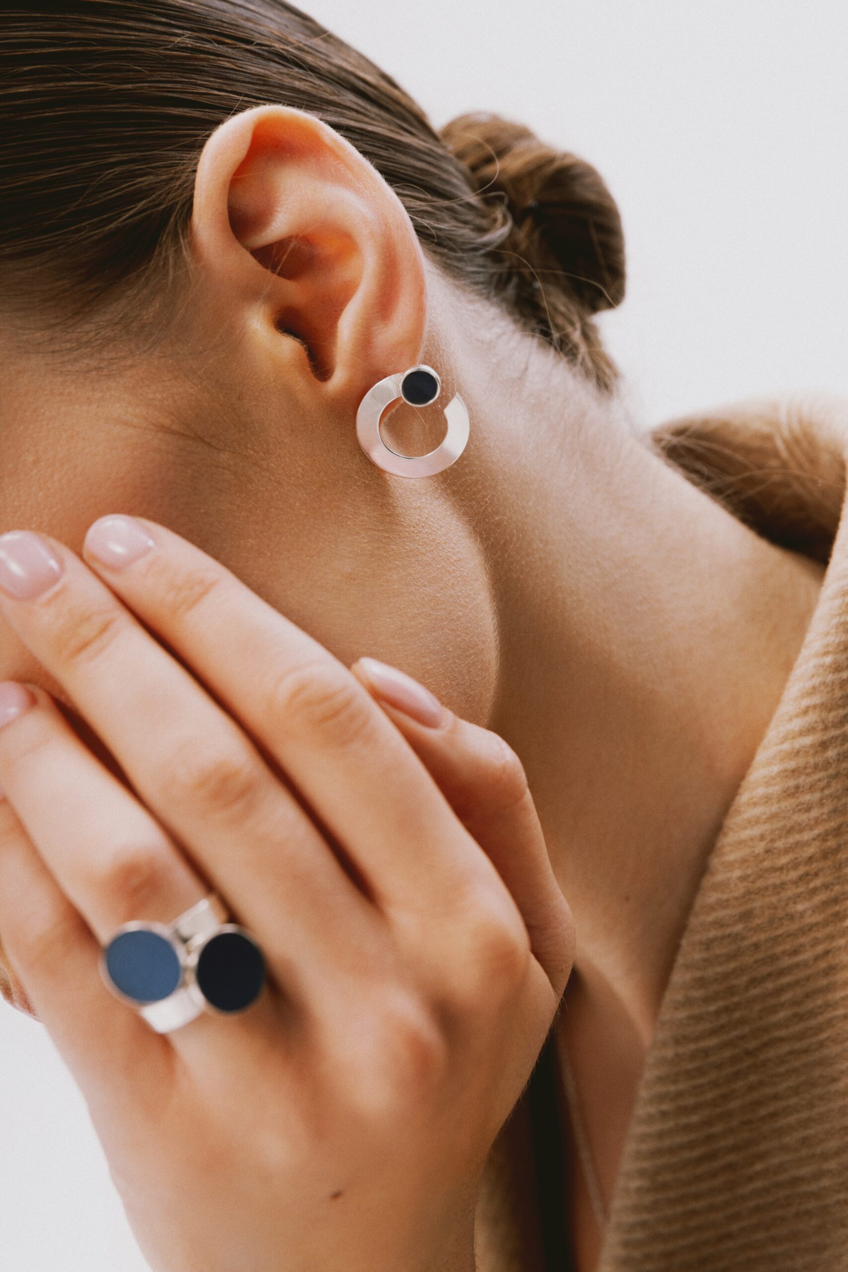 Centralnym elementem pierścionka jest granatowy próbnik lakieru, osadzony w gładkiej oprawie ze srebra próby 925. Kontrast pomiędzy chłodnym srebrem a wyrazistym kolorem podkreśla minimalistyczną formę pierścionka.
