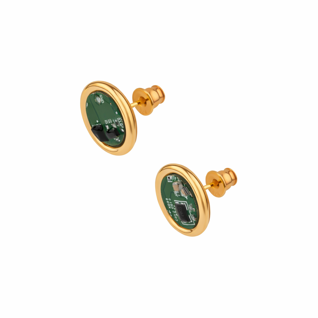 Subtelne kolczyki sztyfty wykonane z pozłacanego srebra oraz fragmentu układu scalonego to minimalistyczny i ponadczasowy element biżuterii codziennej. Do ich produkcji wykorzystano zużyte układy scalone, czyli fragmenty elektroniki, które pochodzą z samochodów marki Volvo.