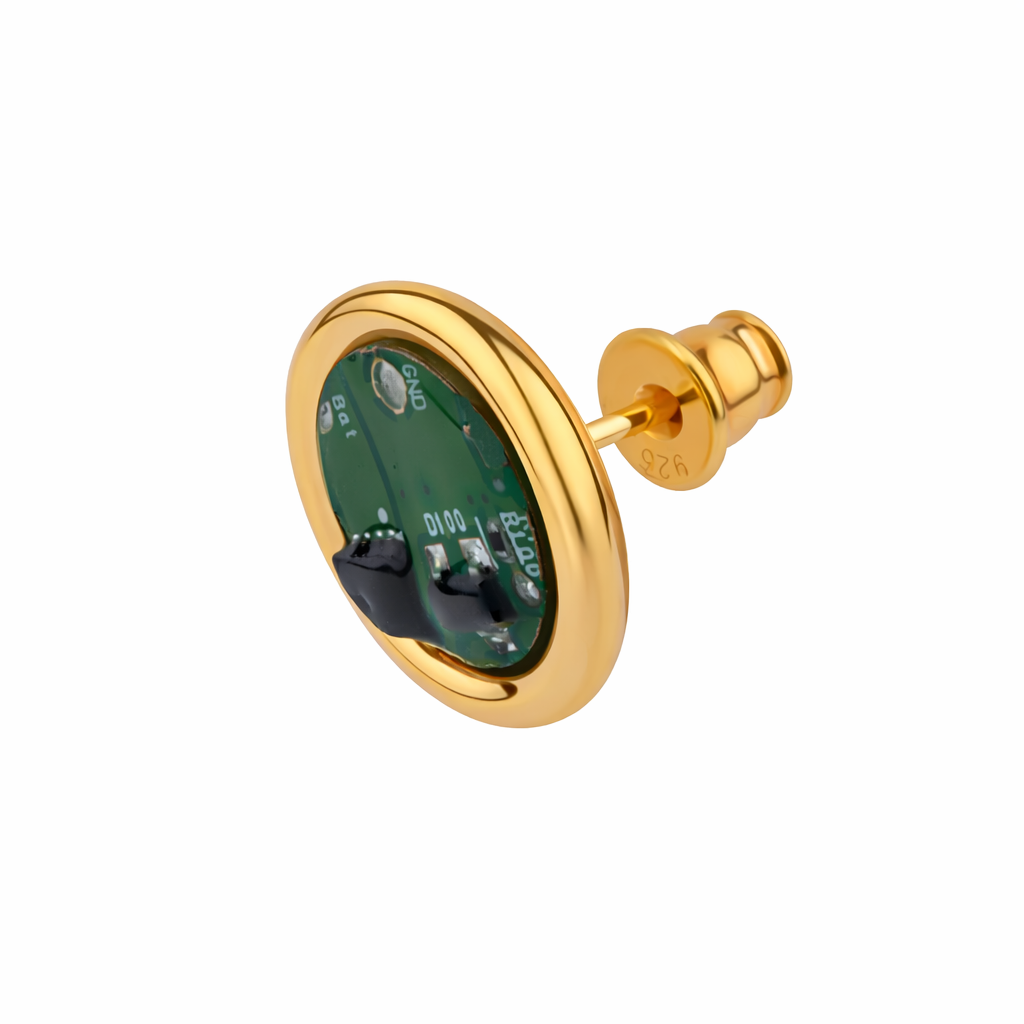 Bazą kolczyków jest srebro próby 925, pozłocone złotem próby 858. Centralnym elementem jest fragment układu scalonego osadzony w gładkiej, pozłacanej oprawie. Układ został zabezpieczony specjalną żywicą, tak aby nie tracił swojej formy, ale zabezpieczał przed uszkodzeniami i skaleczeniami. Dodatkowo dzięki warstwie ochronnej układy scalone nabrały intensywniejszego koloru i połysku. Prosta forma sprawia, że kolczyki doskonale sprawdzą się zarówno w codziennych jak i wieczorowych stylizacjach.